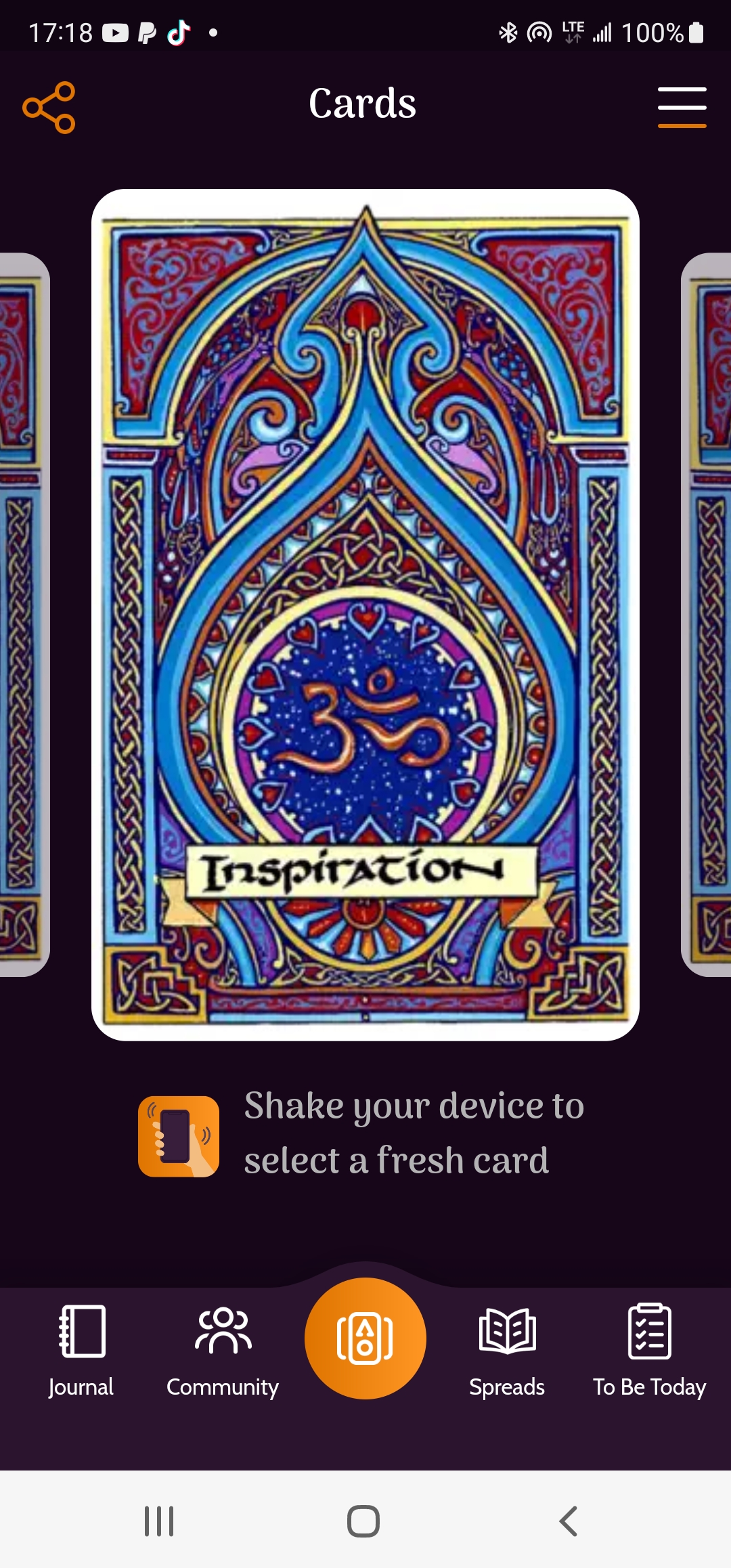 “Share to Others”: After you’ve chosen a card, you can share it by tapping the share emblem in the top left corner. This will bring up various options (text, email, social media, etc.) which you can use to share your Spirit@Work® Card. It will capture the card and include the graphic and text in your post. (This is currently in Beta stage, and we hope to have this running more smoothly soon. Meanwhile, you can post the graphic of the card, but you will need to “cut-and-paste” the text). If you choose email or text, the recipient will receive an email describing the meaning of the card, a link to reveal the actual card itself, together with an invitation to download the app. They also receive a code which automatically adds them to your community.