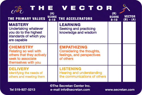 When reviewing performance, coaching others, mentoring, or leading, we often focus on the “performance issues” and this can lead to criticism, judgment and conflict, aggravated by unequal positional power in the conversation. Values-centered Leadership® and the use of The Vector Card removes these barriers, leading to “attunement”–a conversation between peers, grounded in a pure intention of helping each other to grow–without judgment or criticism and free of status and hierarchical or positional power. In traditional “performance management” conversations, we also tend to focus on a snapshot taken at a particular moment–the performance achieved to date, or the personal accomplishments at the time. From this freeze-frame perspective, there is only a minimal view of what the future holds. But inspiring mentors and leaders are deeply interested in passing the torch, in the progress of people–how they will grow and flourish in the future. The Vector is an indispensable way to conduct a coaching or performance management dialogue that measures the direction and magnitude of likely change and encourages personal development and growth – of both parties.